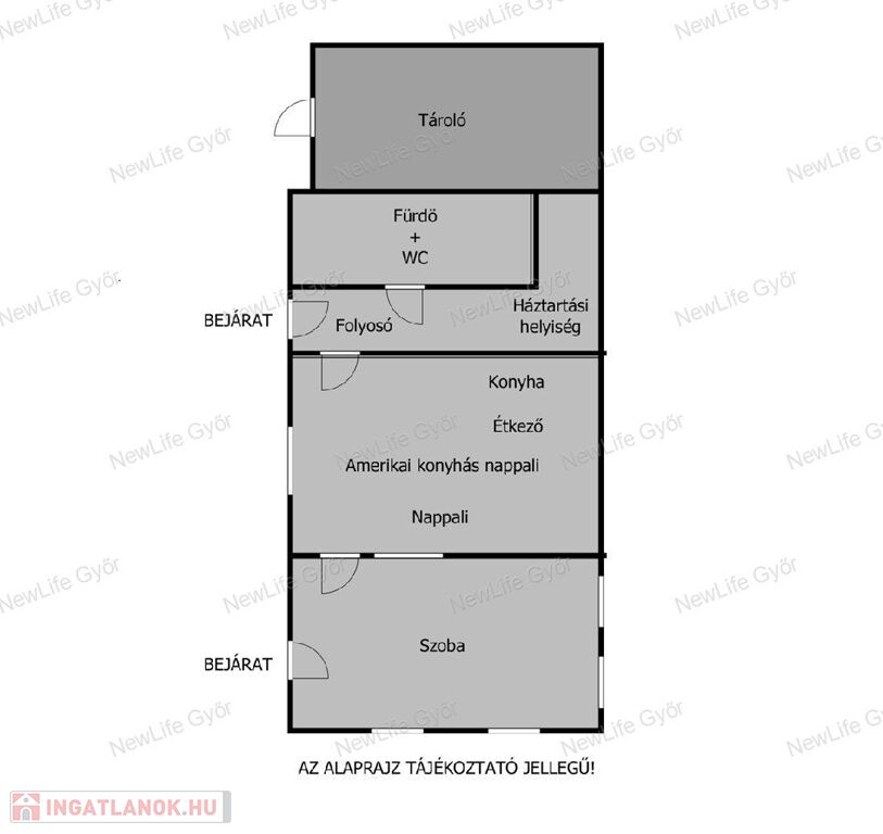 Egy kb. 52 m²-es élettér, amit saját ízlésed szerint alakíthatsz: világos szoba, modern konyha-étkező, fürdőszoba wc-vel, háztartási helyiség és két praktikus tároló, hogy mindig rend legyen.