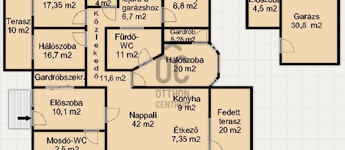 - a földszint + pinceszint helyiségei: 3 hálószoba, nappali, konyha, étkező- terasz kapcsolattal, előszoba, közlekedő, gardrób, mosókonyha, 2 fürdő-WC-vel, 1 WC, lépcsőfeljáró, garázs stb.