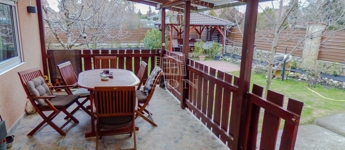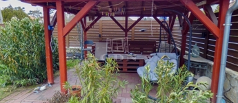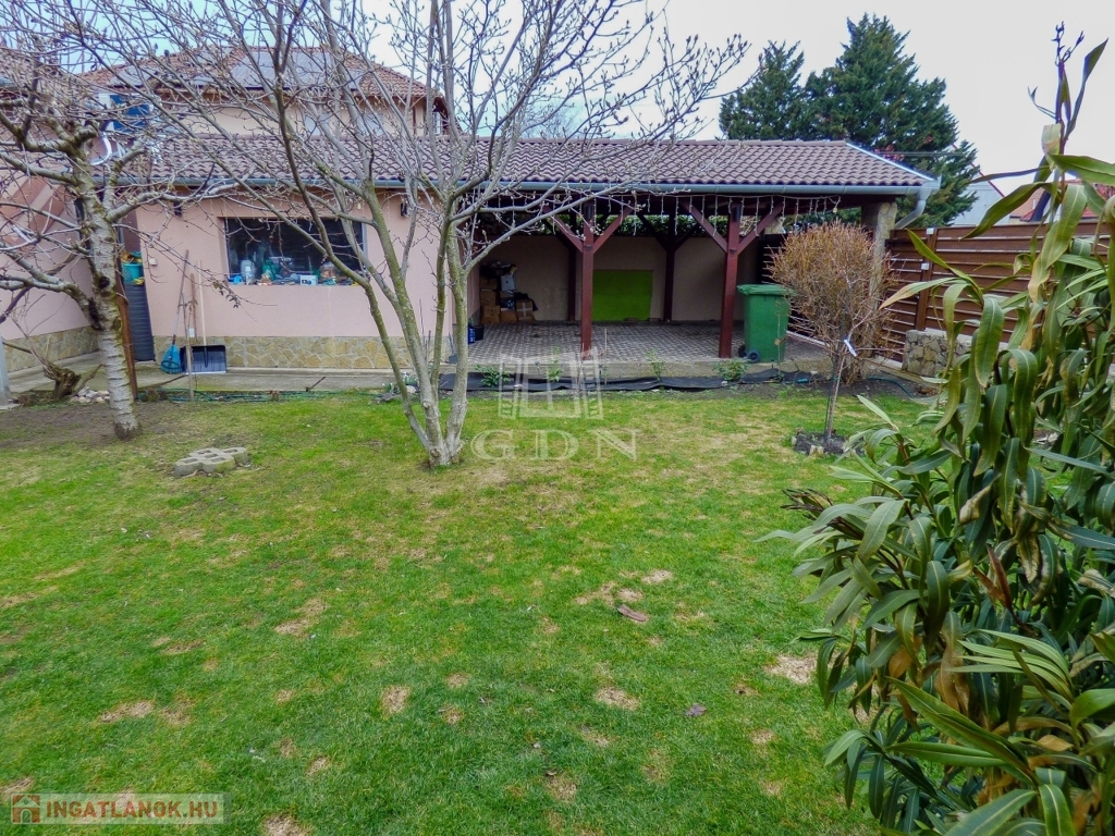 A zárt udvaron 3 autóval meg lehet állni, ebből 2 fedett, az elektromos hálózat felbővített (3*16 A), a kertben egy nagy terasz (20 nm), szaletli (16nm), tároló (20 nm), bográcsozó kapott helyet. Az öntözés fúrt kútról megoldott, a kerítés gondozásmentes.
