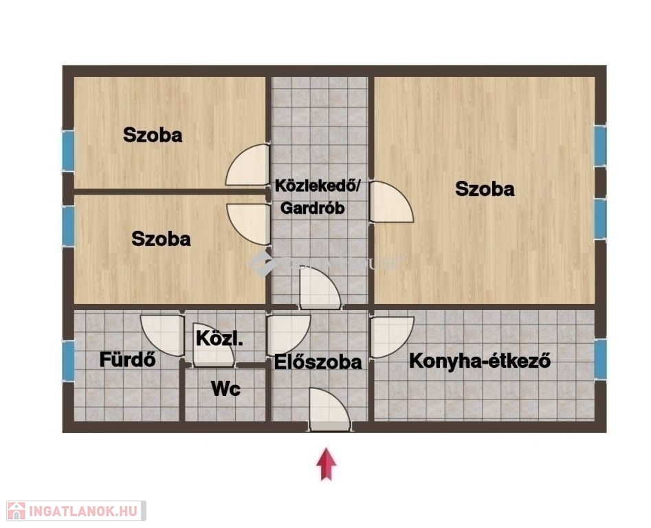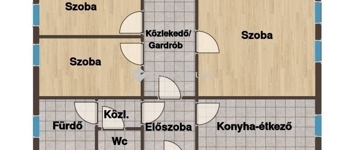 Jelenleg 3 szoba + konyha-étkező elosztás