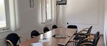 Az irodaház földszintjén öltöző, étkező, szociális helyiségek, raktárak, emeleten irodák - tárgyalók kaptak helyet, konyhával, mosdókkal.