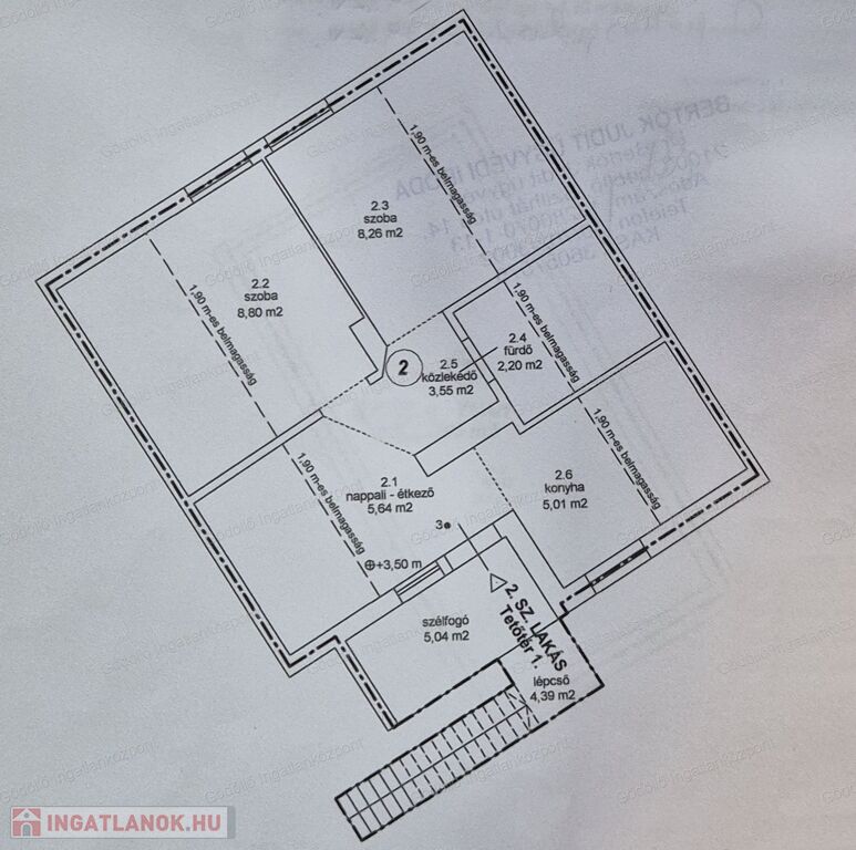 A 42nm-es ingatlan nappali-étkezővel, konyhával, két szobával, közlekedővel, zuhanyzós fürdővel, szélfogóval és lépcsőházzal rendelkezik.