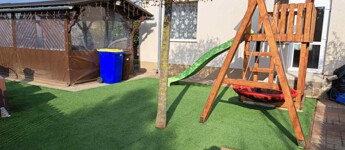 Az udvar igényesen kialakított, műfűvel borított, gondozást alig igényel, kellemes pihenőteret biztosít. A kényelmet tovább növeli az 1 állásos autóbeálló.