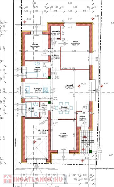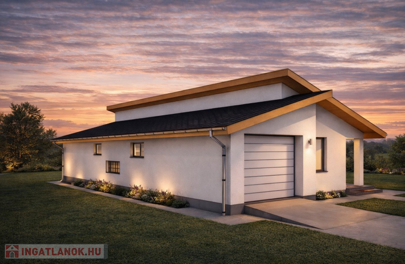 Kiváló adottságú telek előnyeit figyelembe véve alaposan átgondolt tervezés alapján épül az ingatlan benapozottsága optimális.