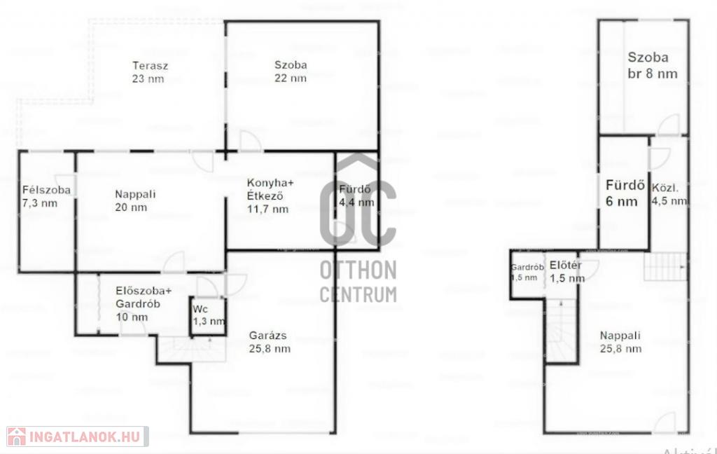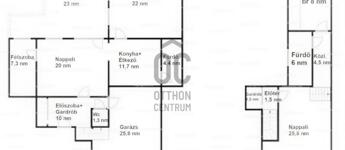- helyiségek a földszinten: 2 hálószoba, nappali, amely terasz /23 m2/ kapcsolattal rendelkezik, közlekedő, konyha-étkező, fürdő-WC, külön WC, garázs-103 m2