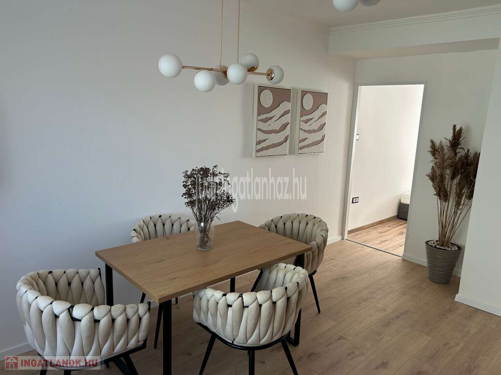 Nyíregyházán a Megyei kórház közelében eladó 59 m2-s, három különnyíló szobás, nagy konyha+étkező, külön fürdőszoba és wc, kamra, erkélyes, műanyag nyílászárós mely redőnnyel felszerelt, egyedi gáz és klíma fűtésű felújított lakás téglaépítésű szigetelt 6 lakásos zárt udvaros társas házban a második emeleten. Az ingatlan 2025-ben teljes felújításon esett át, vezeték és csövek cseréje megtörtént, új burkolat, minőségi falfestés. Az ingatlan ára a fotón látható teljes új bútorzattal együtt értendő, továbbá tartozik hozzá egy 13 m2-s udvari garázs az alagsorban saját tároló és saját udvari kert rész. Parkolni az utcán lehet díjtalanul. Az igényesen felújított és berendezett tehermentes ingatlanba költözni akár azonnal!