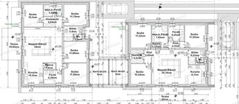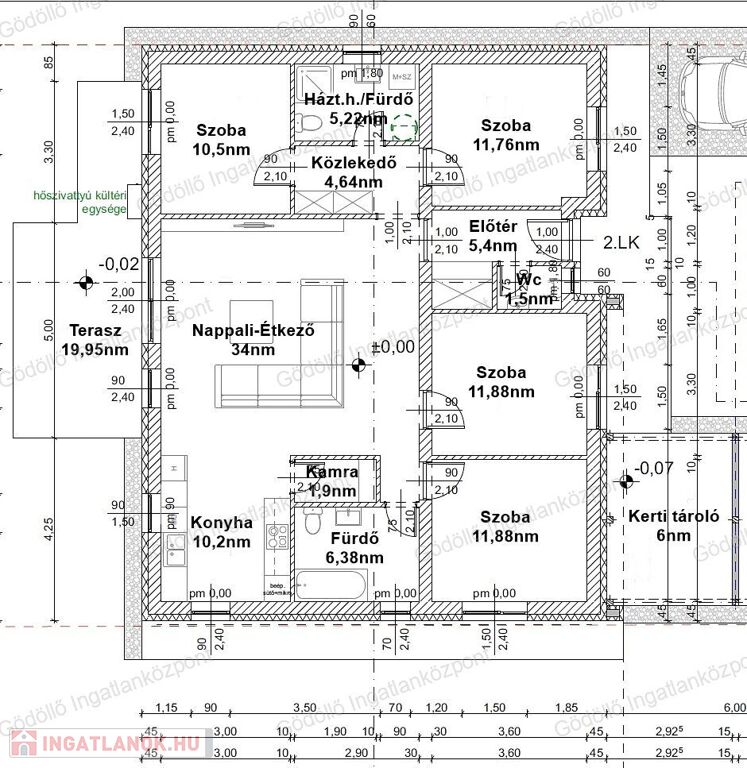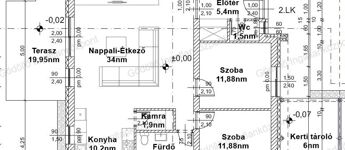 - Előtér, nappali-konyha-étkező, kamra, 4 szoba, gardrób, fürdőszoba, háztartási helyiség/fürdő + 19,95nm terasz + 6nm tároló