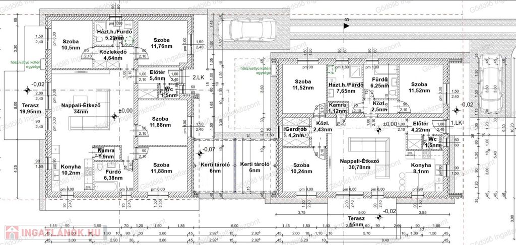 - garázs választja el a két oldalt, így nincs közös falrész.