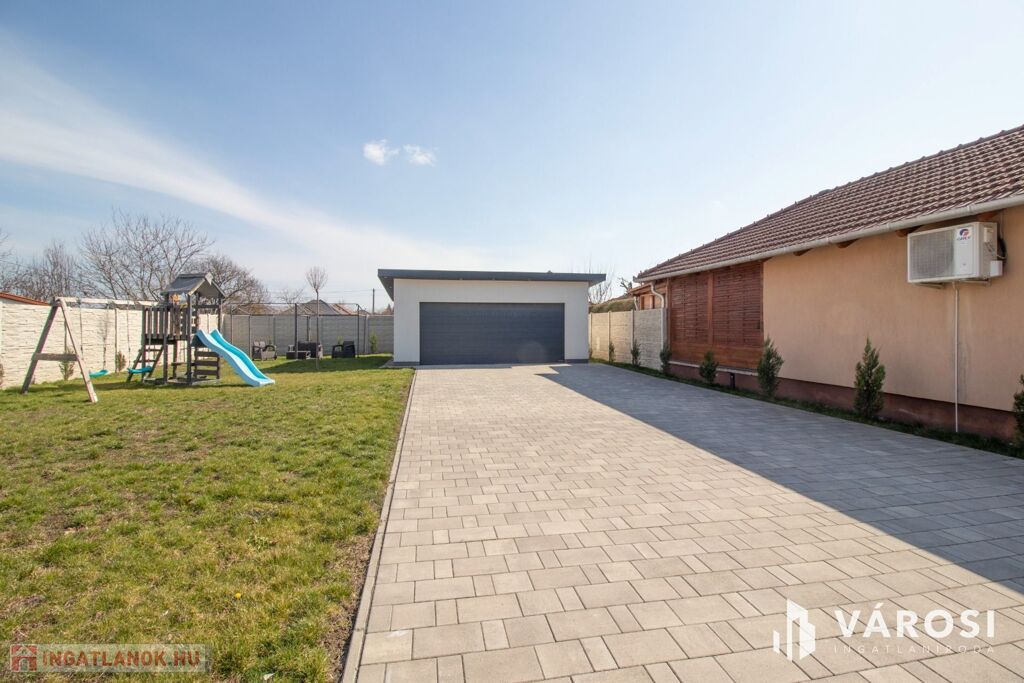 Az elektromos garázskapuval felszerelt, 35 m²-es dupla garázsban kényelmesen elfér két autó is, az udvar nagy része Frühwald térburkolattal burkolt, de maradt hely a kerti játszótérnek, illetve zöldfelületnek is.