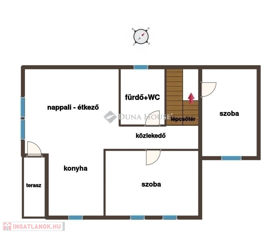 Az ingatlan 72 m2, 2 szoba + amerikai konyhás nappali, közlekedő, fürdő+WC, erkély és lépcsőtér alatti tároló elrendezésű.