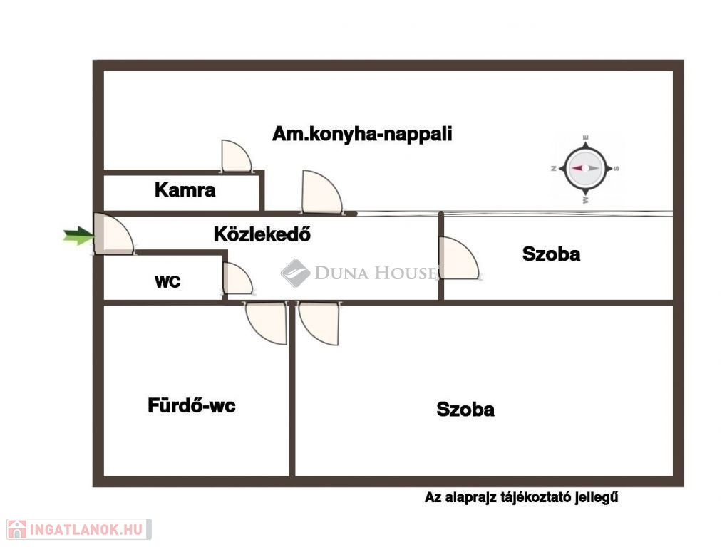 Az ingatlan nappali–konyha–étkezővel, két hálószobával, fürdőszobával és két külön WC-vel rendelkezik, így akár család számára is kényelmes otthon lehet. A lakás jó állapotú, ugyanakkor igény szerint korszerűsíthető, így az új tulajdonos saját elképzelései szerint alakíthatja.