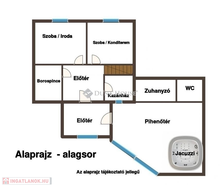 * Alsó szinten: pince/tároló + fogadótér, edzőterem, iroda
