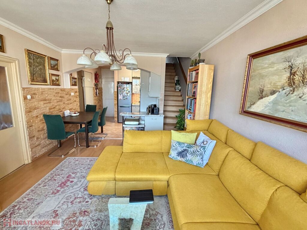 Alsó szinten: nappali - konyha - étkező erkéllyel, kamra, 1 szoba gardróbbal, wc