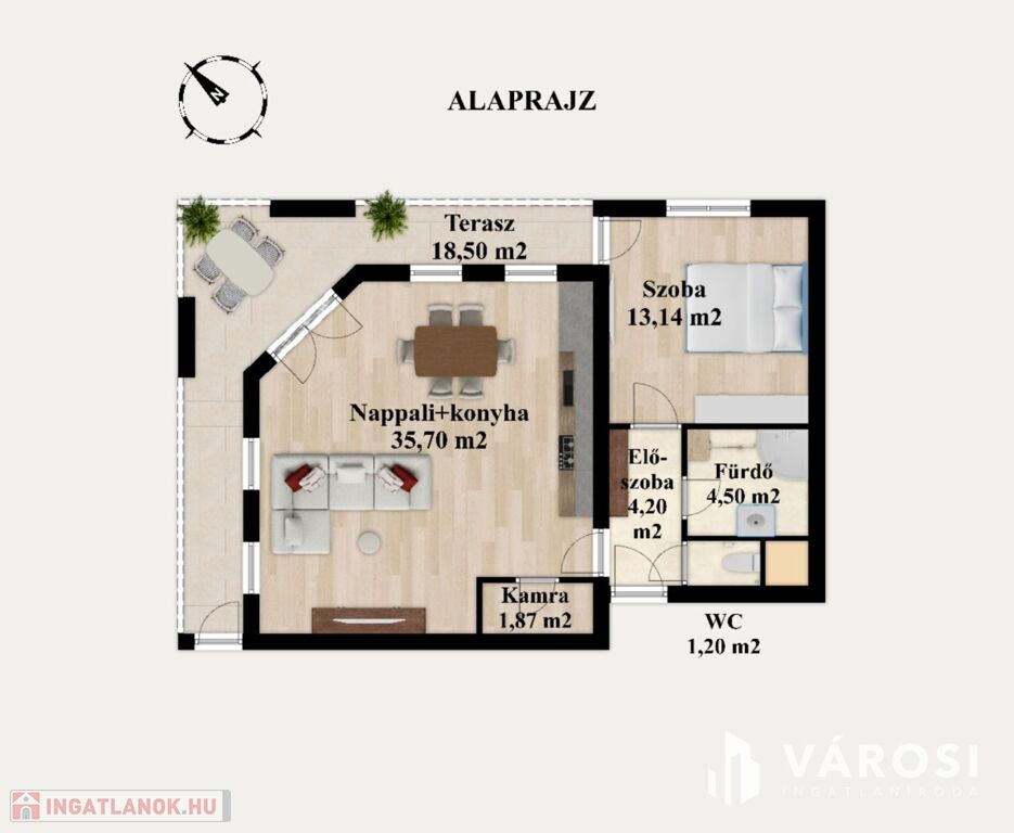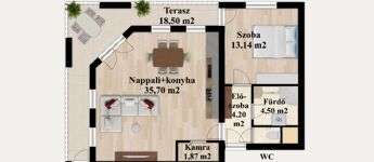 - Nappali + 1 hálószoba, amerikai konyhás kialakítással – tágas, világos tér a kényelmes mindennapokhoz