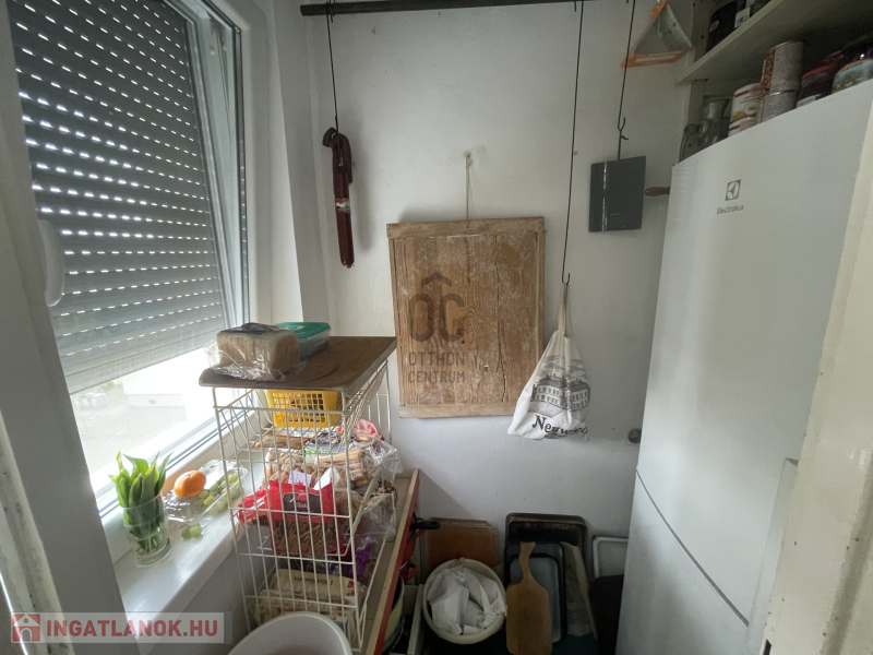-a konyha tágas, ablakkal ellátott, innen nyílik egy kamra is,