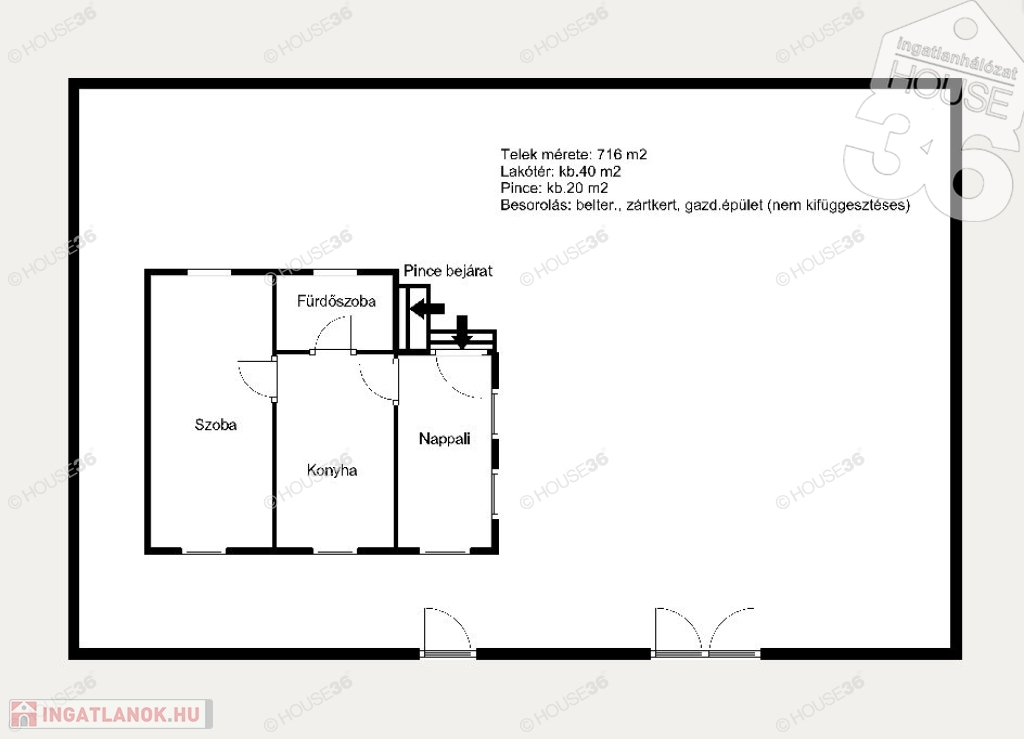 - Lakótér: br.40 m2 : nappali, konyha, fürdőszoba, hálószoba