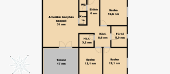 Nappali, konyha étkezővel 3 szoba, fürdőszoba, WC, háztartási helyiség és egy előszoba is található benne. Udvar felől nagy nyitott terasz is lehetőséget ad, a szabadban való pihenésre. A minimális energiaigényű kivitelezés, Porotherm falazat, 15 centiméteres külső szigetelés, 3 rétegű üvegezéssel ellátott nyílászárók és a legmodernebb hőszivattyús fűtés, A+++ -os energiahatékonysági besorolást és gazdaságos üzemeltetést biztosít.