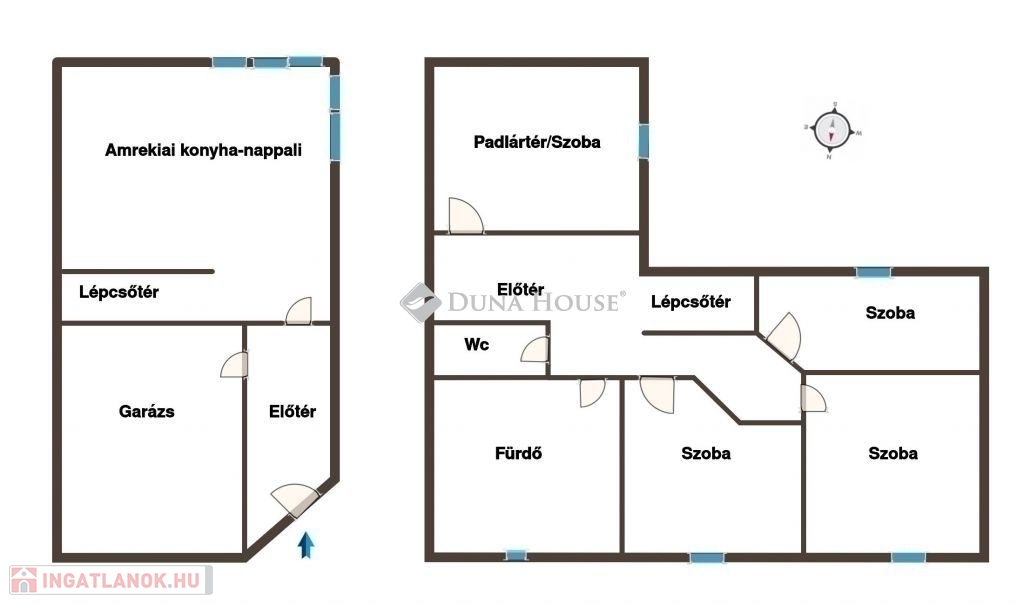 3 hálószoba · nappali · fürdőszoba · különálló WC · fűtött garázs (belső bejárattal) · tetőtéri tároló (ablakos, természetes fényes)