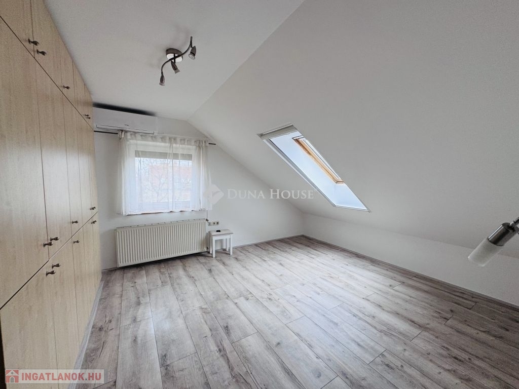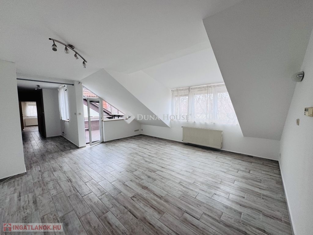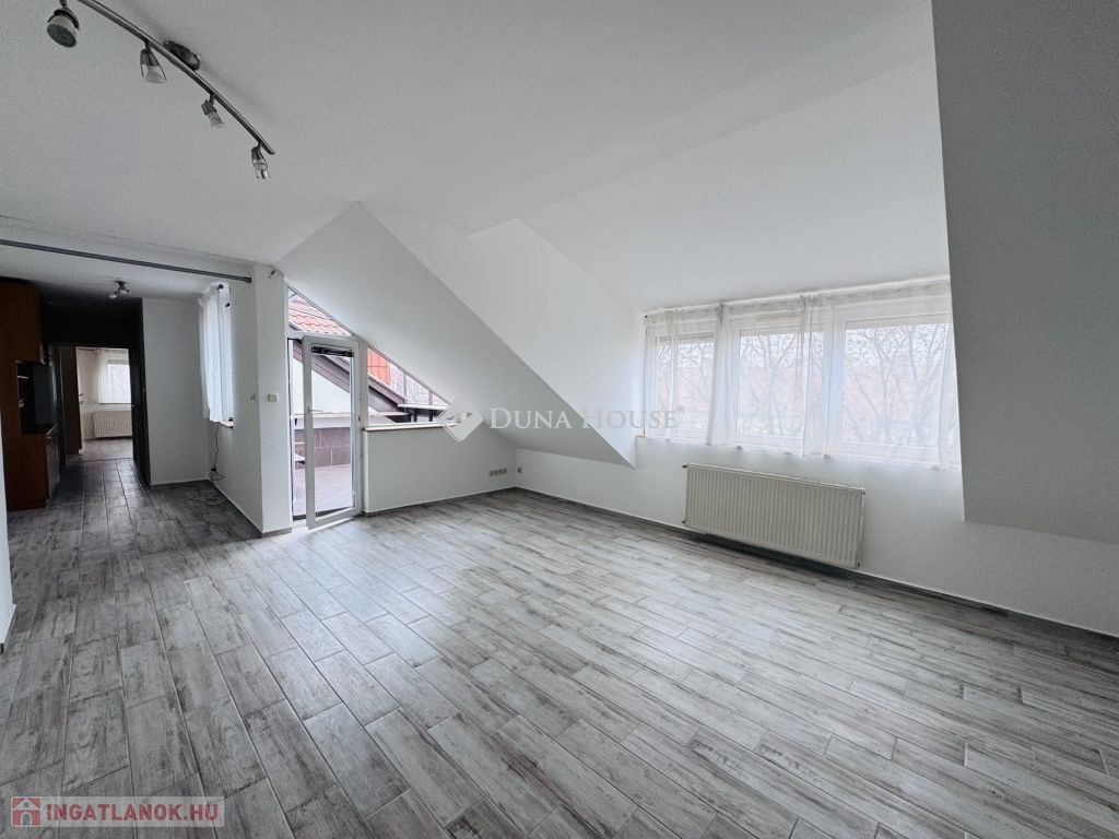 Eladó tetőtéri lakás Pécs közkedvelt Uránváros városrészében!Pécs egyik legkedveltebb, zöldövezeti részén, Uránvárosban eladóvá vált egy 1990-ben épült, kiváló állapotú, egyedi gázfűtéses tetőtéri lakás. Az ingatlan elrendezése és tágas tereinek köszönhetően ideális választás akár családok számára is.A lakás nettó alapterülete jól átgondolt elrendezésű:két különnyíló hálószoba,egy tágas, világos nappali,külön konyha és étkező,fürdőszoba és külön WC,kamra,dolgozósarok a gardrób részeként.A lakáshoz tartozik egy kb. 15 m²-es nagyméretű terasz, amely kiváló helyszínt biztosít pihenésre vagy baráti összejövetelekre.A lakás fenntartási költsége rendkívül kedvező, a fűtést és meleg vizet egyedi gázkazán biztosítja.A minőségi konyhabútor és beépített konyhai gépek a vételár részét képezik, ahogy a jelenlegi bútorzat is megegyezés tárgyát képezi.Az ingatlanhoz saját tároló is tartozik, a ház pedig rendezett, zöldövezeti környezetben található, jó szomszédsággal és kiváló infrastruktúrával: boltok, iskola, óvoda, buszmegálló néhány perces sétával elérhető.