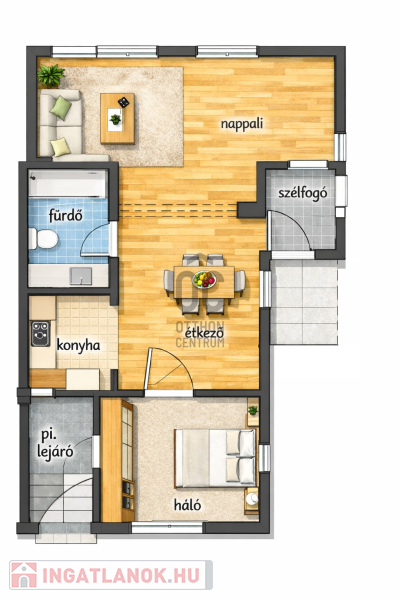 • Földszint: amerikai konyhás nappali–étkező, hálószoba, fürdőszoba mellékhelyiséggel