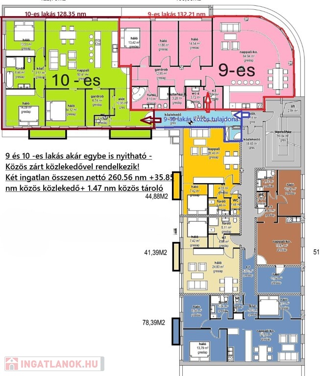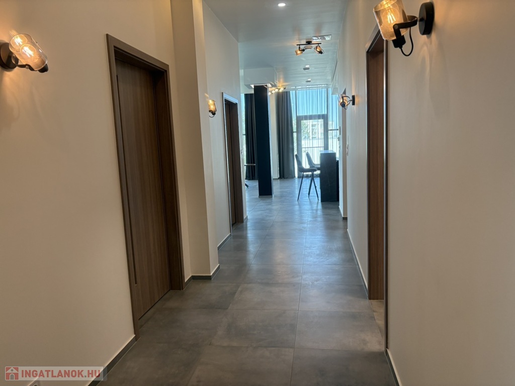 A lakáshoz tartozik egy 35,85 m²-es, zárt, kizárólagos használatú közlekedő és előtér-rész, amely elegáns érkezést biztosít, és igény esetén lehetőséget ad arra is, hogy a szomszédos lakással könnyedén összekapcsolható legyen.