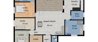 - Nappali, konyha,4 hálószoba,2 fürdő, külön WC, háztartási helyiség.